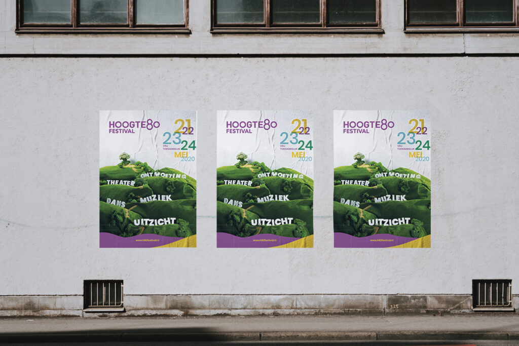 Hoogte80 is een kunst- en muziekfestival in Arnhem. Al meerdere jaren verzorgt Cre-Aid hiervoor de campagne. Voor de campagne van 2020 heb ik de iconische heuvels, waarop